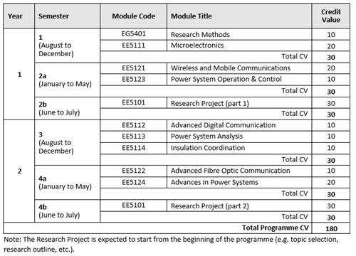 The programme also aims to provide continuing professional development opportunities related to the electrical and electronic engineering. Hence, the programme can be delivered through a two-year part-time basis, in addition to the one-year full-time programme.