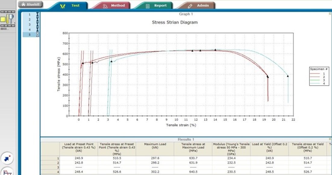 The test controllers, panels and software have recently been upgraded to Instron Bluehill 3. The testing machines come with all the common accessories such as various types of grips, extensometers, bending and compression fixtures. Such accessories enable the testing of rods, sheets, blocks, fabrics, wires and ropes of metallic as well as non-metallic materials.