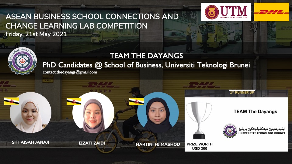 21 May 2021 – A team of three PhD students from Universiti Teknologi Brunei (UTB) bagged second place in the ASEAN Business School Connections and Change Learning Lab Competition organised by Azman Hashim International Business School (AHIBS) of Universiti Teknologi Malaysia (UTM) and DHL Express Malaysia.